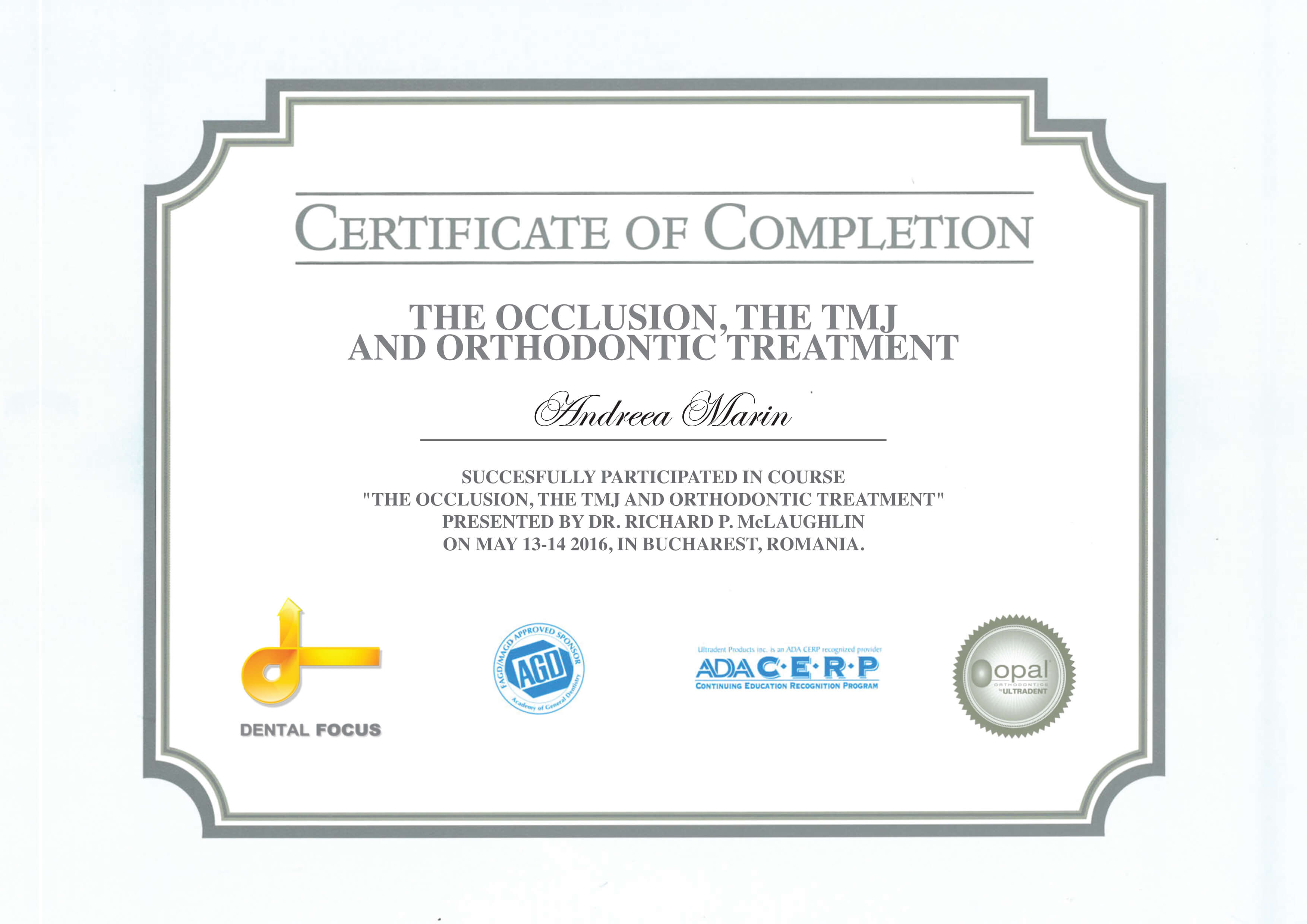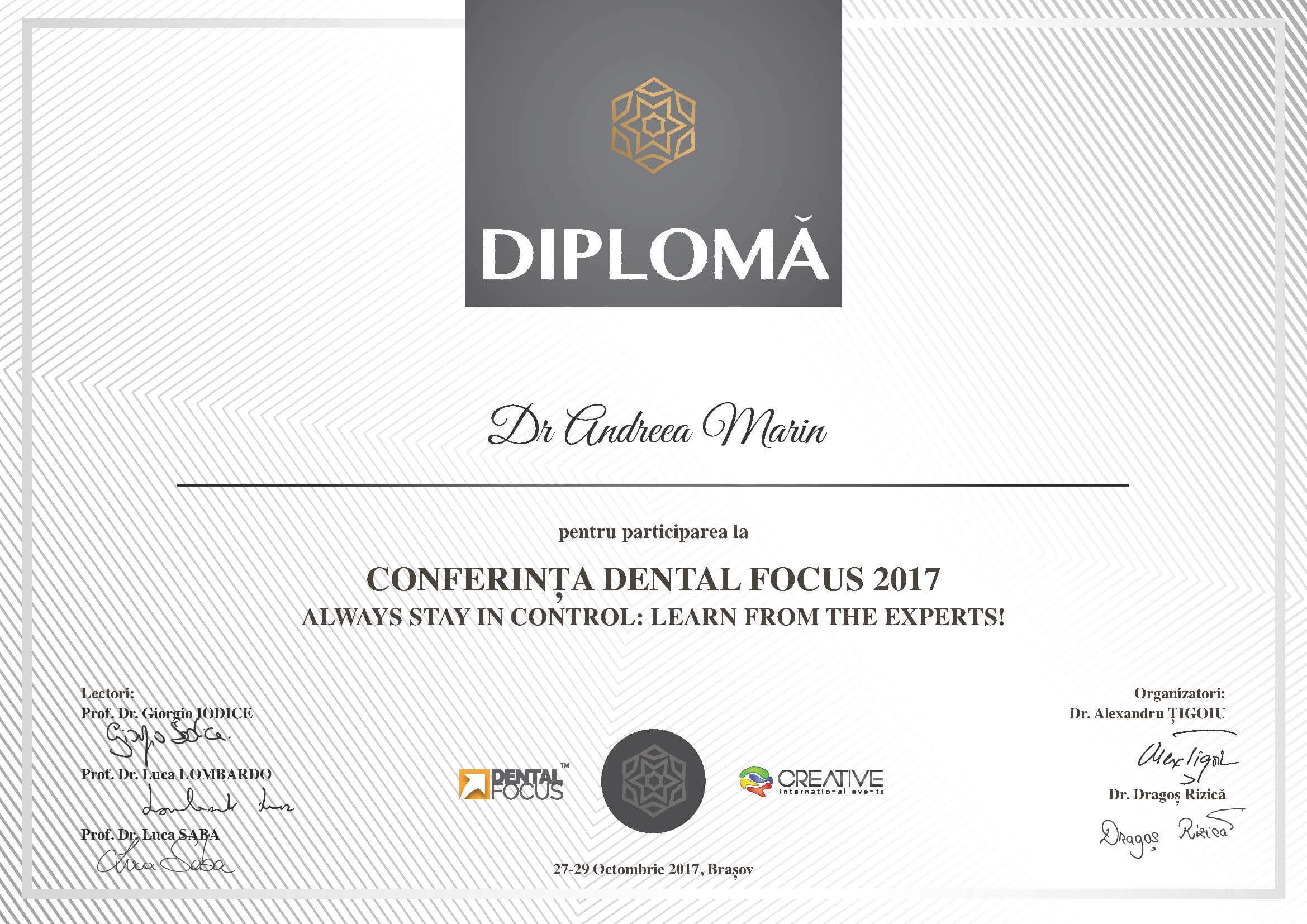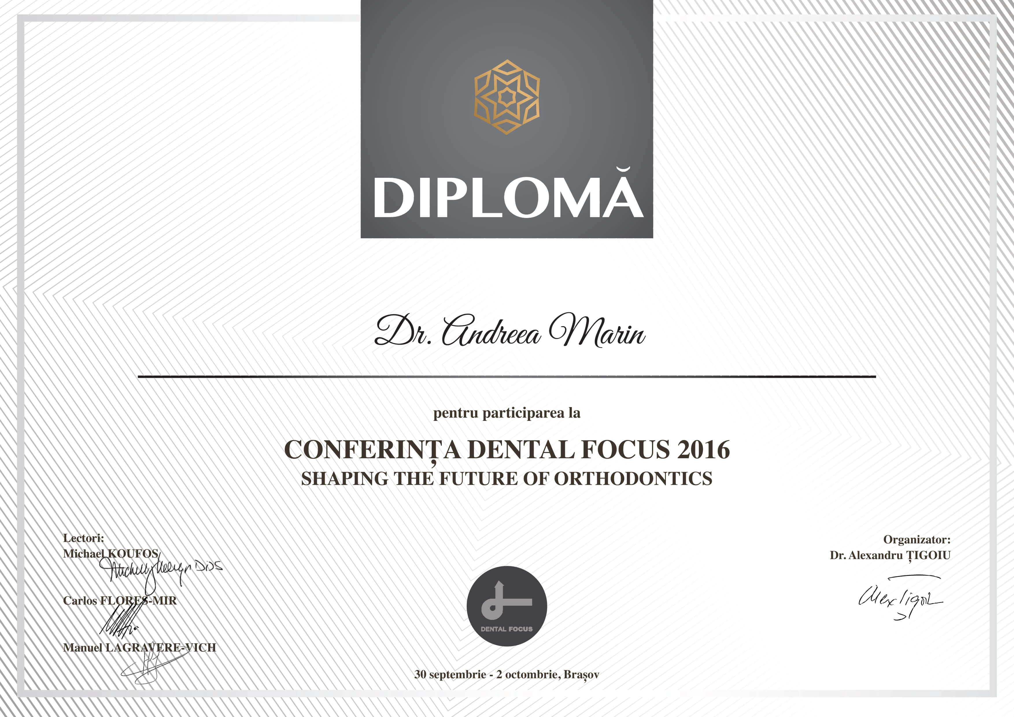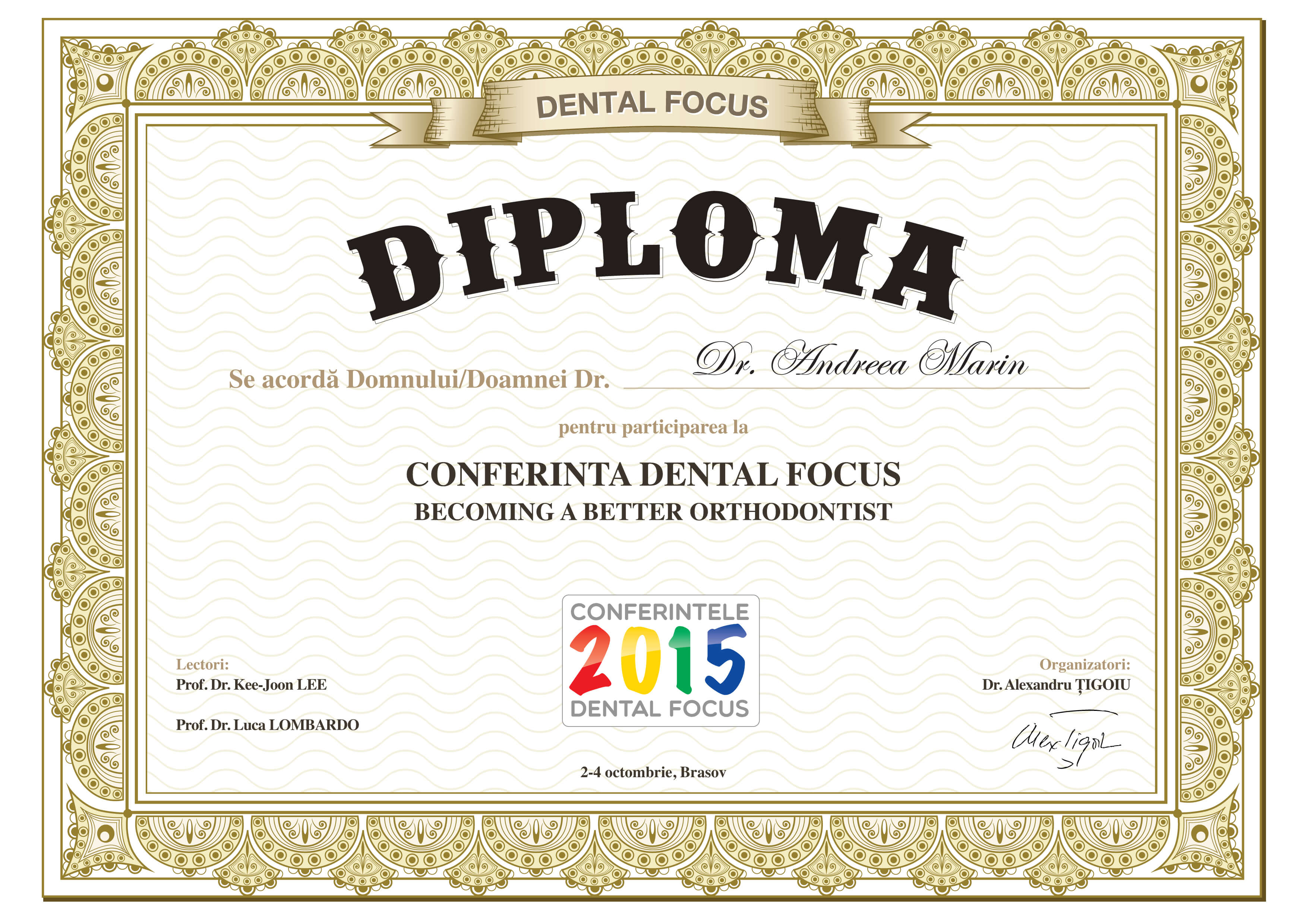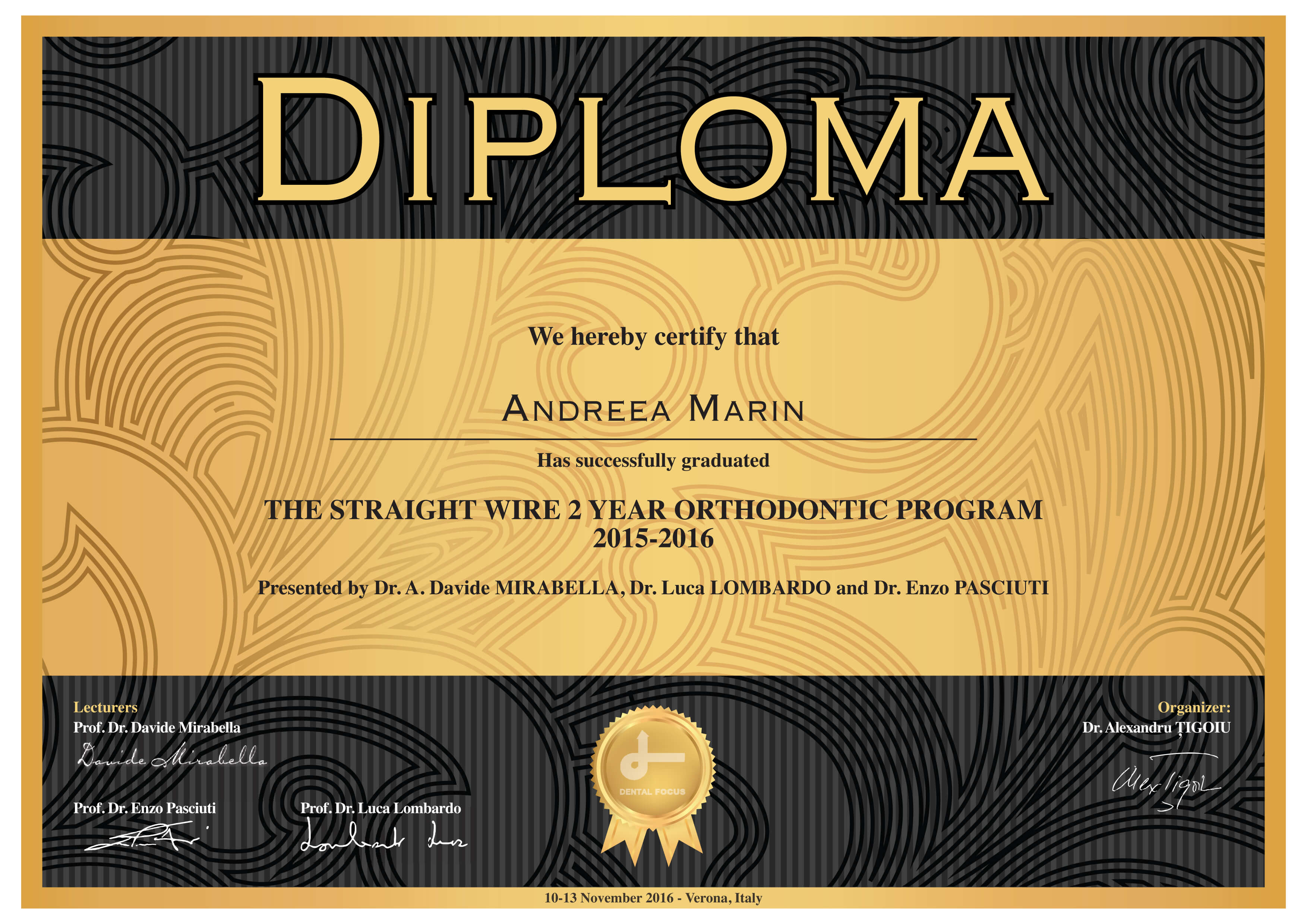- Noiembrie 2016 - Prof. Dr. Davide Mirabella, Prof. Dr. Luca Lombardo - Programul de 2 ani pentru perfectionare in tehnica Straight-Wire - "Treatment of Class III malocclusions, the interdisciplinary approach, difficult clinical cases and miniscrews" - Verona, Italia
