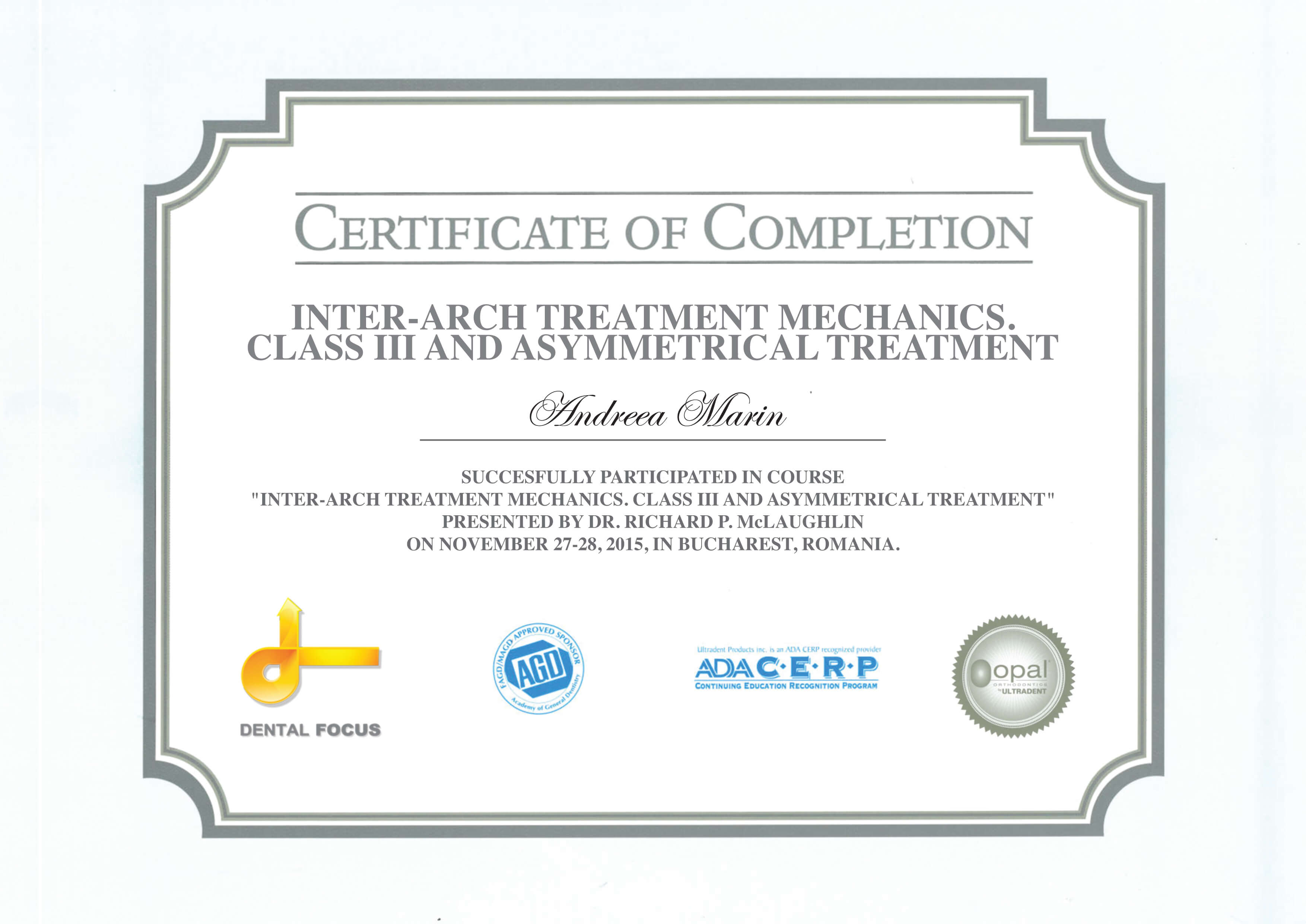 - Noiembrie 2015 - Prof. Dr. Richard P. McLaughlin - "Inter-arch treatment mechanics. Class III and asymmetrical treatment"