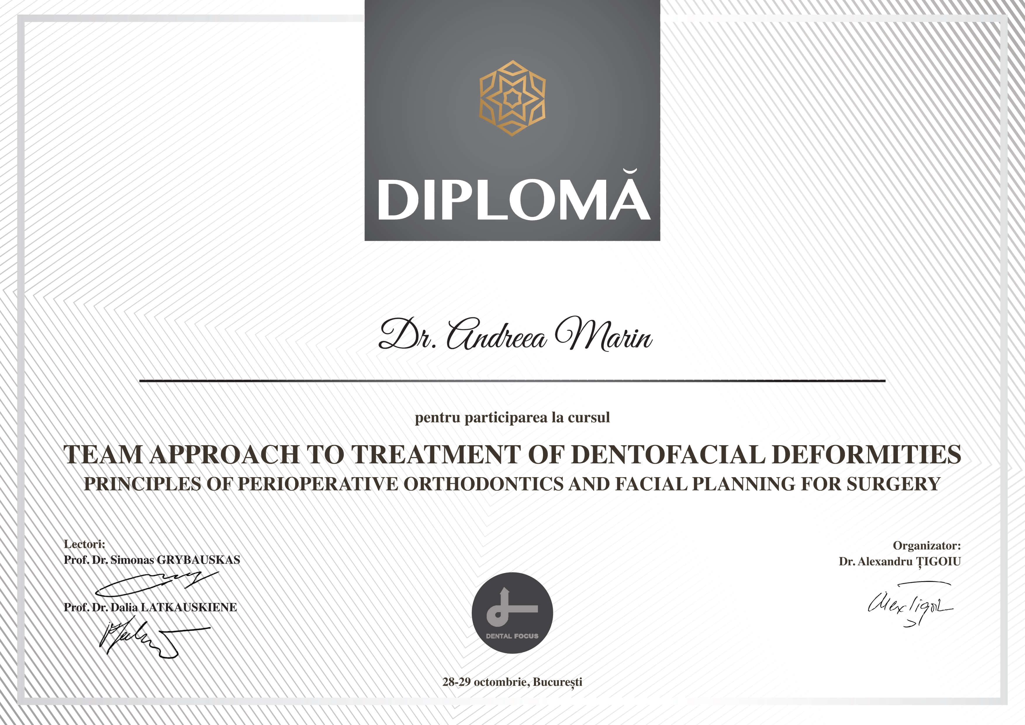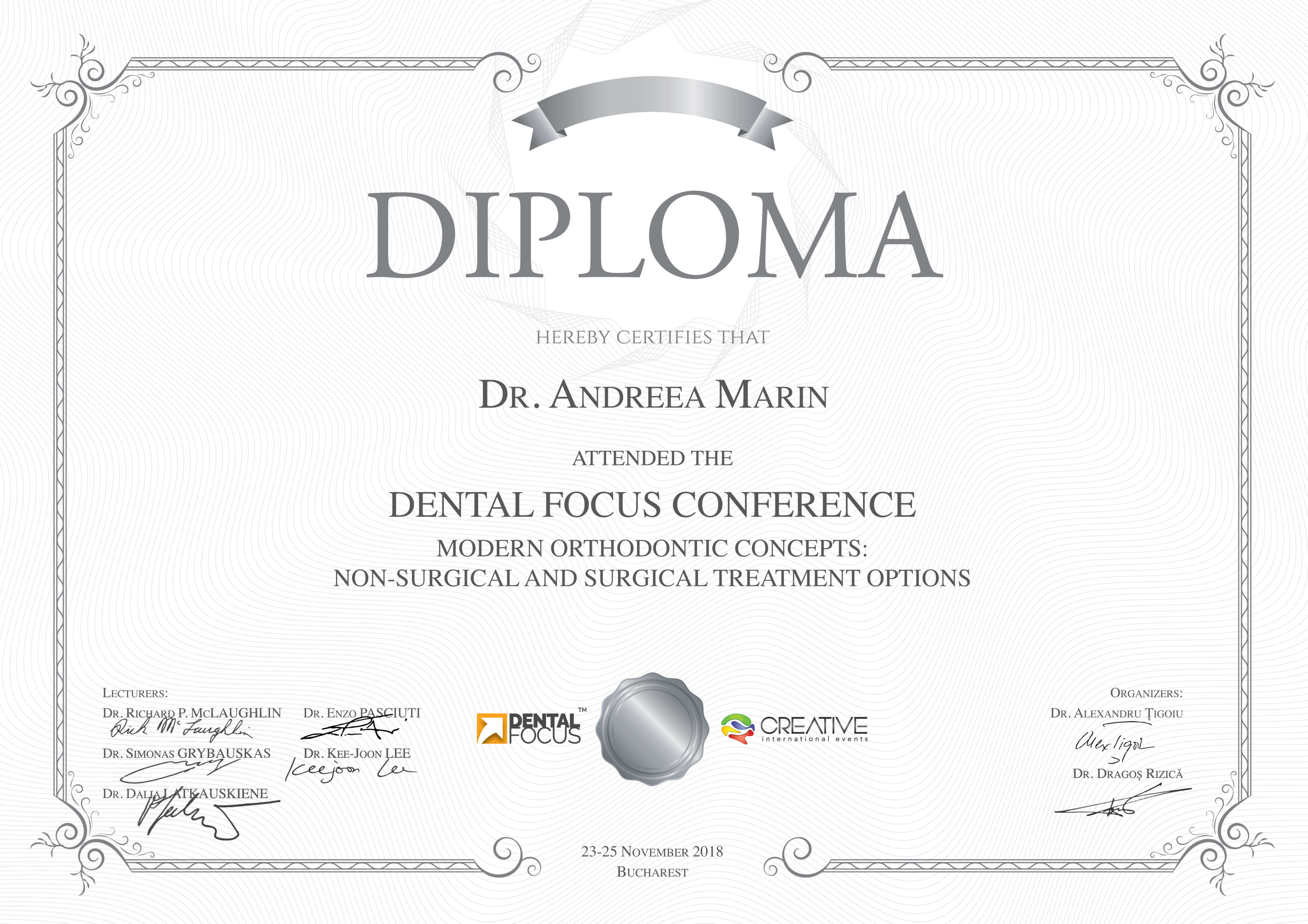 - Noiembrie 2018 - Dr. Richard P. McLaughlin, Dr. Simonas Grybauskas, Dr. Dalia Latkauskiene, Dr. Enzo Pasciuti, Dr. Kee-Joon Lee - “Dental Focus Conference - Modern orthodontic concepts: non-surgical and surgical treatment options”