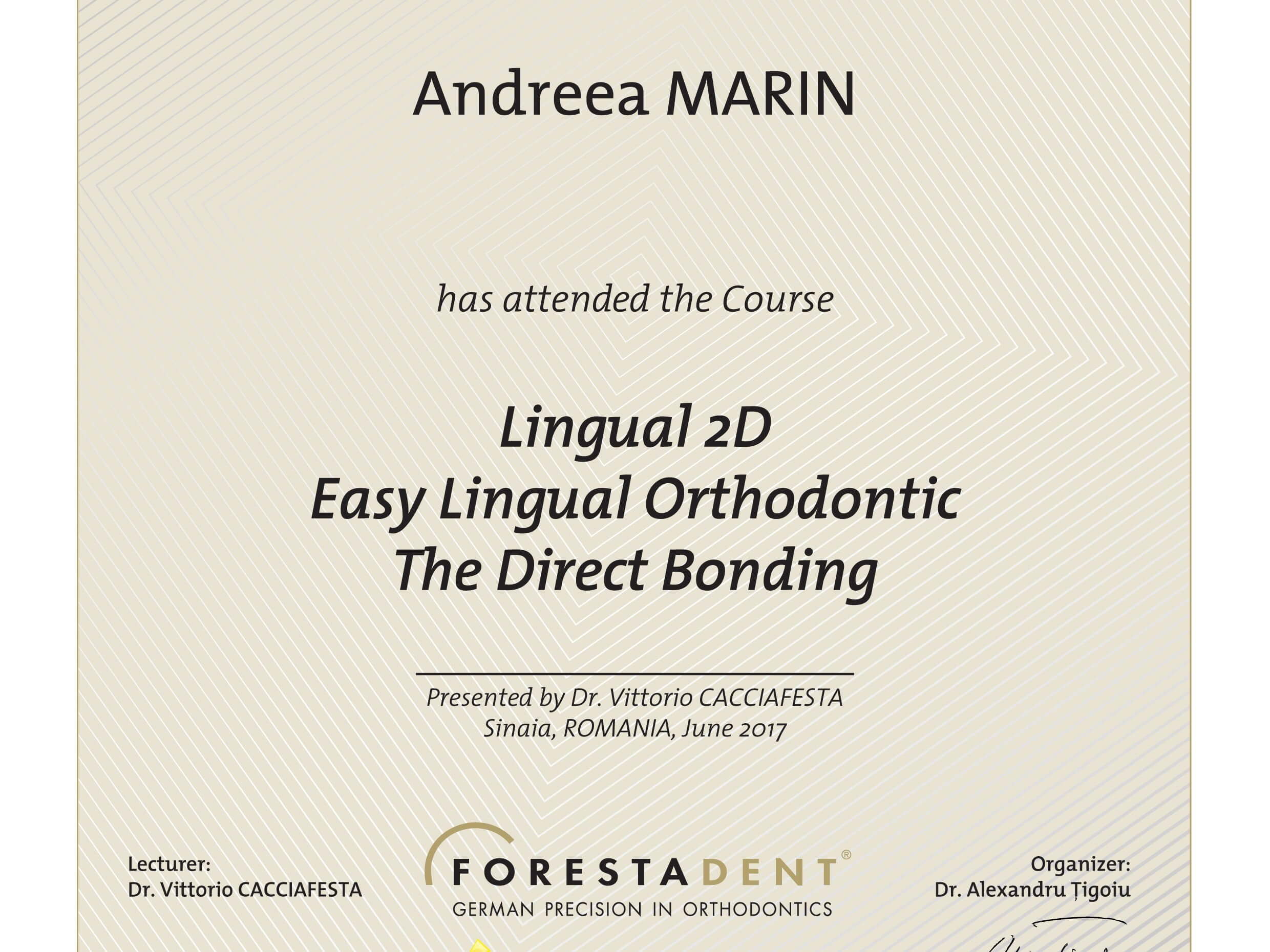 - Iunie 2017 - Dr. Vittorio Cacciafesta - "Lingual 2D - Easy Lingual Orthodontic - The Direct Bonding"